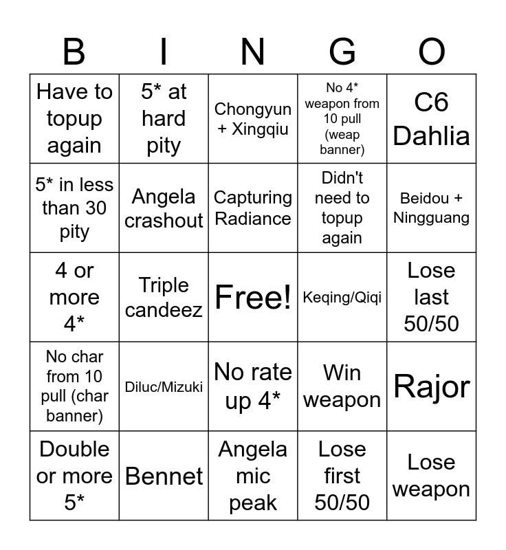 This bingo card has a free space and 24 words: Diluc/Mizuki, Bennet, Capturing Radiance, Double or more 5*, C6 Dahlia, Have to topup again, 5* in less than 30 pity, 5* at hard pity, Keqing/Qiqi, No rate up 4*, Didn't need to topup again, 4 or more 4*, Win weapon, Rajor, Angela crashout, Lose first 50/50, Lose last 50/50, Chongyun + Xingqiu, Beidou + Ningguang, Triple candeez, Lose weapon, No char from 10 pull (char banner), No 4* weapon from 10 pull (weap banner) and Angela mic peak.