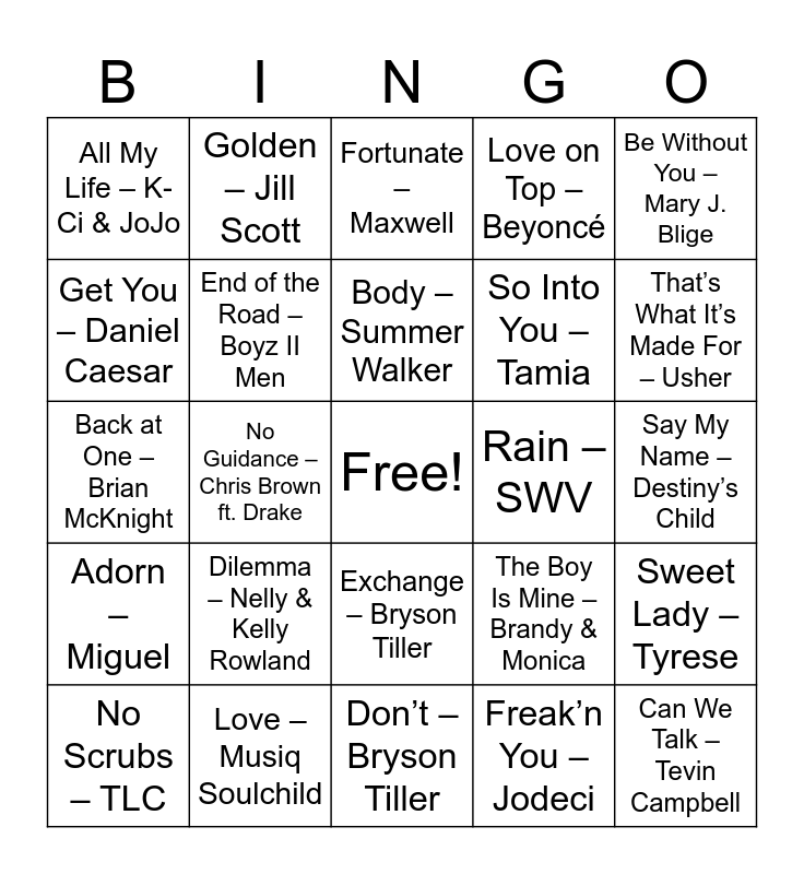 This bingo card has a free space and 25 words: Adorn – Miguel, Love – Musiq Soulchild, Don’t – Bryson Tiller, Freak’n You – Jodeci, Be Without You – Mary J. Blige, All My Life – K-Ci & JoJo, Golden – Jill Scott, Fortunate – Maxwell, Rain – SWV, Sweet Lady – Tyrese, Get You – Daniel Caesar, End of the Road – Boyz II Men, FREE SPACE, The Boy Is Mine – Brandy & Monica, That’s What It’s Made For – Usher, No Scrubs – TLC, No Guidance – Chris Brown ft. Drake, Body – Summer Walker, So Into You – Tamia, Say My Name – Destiny’s Child, Back at One – Brian McKnight, Dilemma – Nelly & Kelly Rowland, Exchange – Bryson Tiller, Love on Top – Beyoncé and Can We Talk – Tevin Campbell.