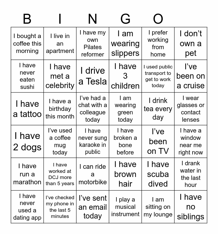 This bingo card has 48 words: I’ve worn headphones today, I have a tattoo, I have never ridden a horse, I’ve been on TV, I drink tea every day, I have brown hair, I live in an apartment, I have travelled overseas this year, I don’t own a pet, I’ve checked my phone in the last 5 minutes, I have never eaten sushi, I am wearing slippers, I’ve used a coffee mug today, I have 2 dogs, I have no siblings, I can ride a motorbike, I have met a celebrity, I have a birthday this month, I have never been overseas, I prefer working from home, I’ve been on a cruise, I have a window near me right now, I bought a coffee this morning, I drive a Tesla, Free!, I have 3 children, I have never sung karaoke in public, I have never been in a plane, I wear glasses or contact lenses, I am wearing green today, I have jumped out of a plane, I have worked at DCJ more than 5 years, I am sitting on my lounge, I’m an early riser, I have broken a bone before, I’ve sent an email today, I play a musical instrument, I’ve had a chat with a colleague today, I have never used a dating app, I’ve lived in more than three cities, I have scuba dived, I have run a marathon, I have my own Pilates reformer, I wore something blue today, I used public transport to get to work today, My favourite NRL team is the Roosters, I drank water in the last hour and I have a pet bird.