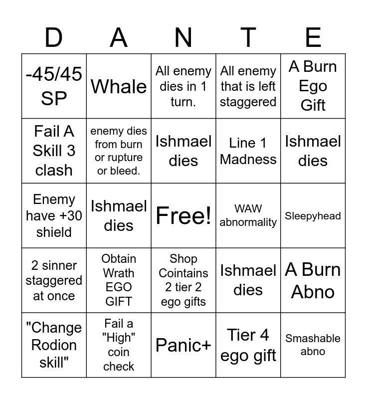 This bingo card has a free space and 24 words: Obtain Wrath EGO GIFT, Fail a "High" coin check, Ishmael dies, "Change Rodion skill", A Burn Ego Gift, -45/45 SP, Fail A Skill 3 clash, Whale, WAW abnormality, Shop Cointains 2 tier 2 ego gifts, Line 1 Madness, Enemy have +30 shield, Ishmael dies, A Burn Abno, enemy dies from burn or rupture or bleed., Tier 4 ego gift, Sleepyhead, All enemy dies in 1 turn., Ishmael dies, Ishmael dies, Smashable abno, 2 sinner staggered at once, All enemy that is left staggered and Panic+.