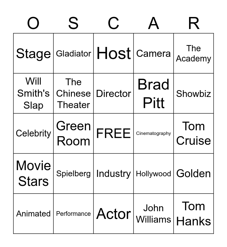 This bingo card has a free space and 39 words: Lady Gaga, Lights, Camera Action, Red Carpet, Hollywood, Golden, Movie Stars, Green Room, Producer, Cinematography, Tom Cruise, Will Smith's Slap, Gladiator, Awards, Showbiz, Celebrity, Spielberg, Industry, Camera, Stunts, Animated, The Chinese Theater, Director, John Williams, The Academy, Gala, Performance, Actor, Trophy, Nominees, Stage, Costumes, Winner, Brad Pitt, Tom Hanks, LA, Paramount, Host, Monologue and Speeches.