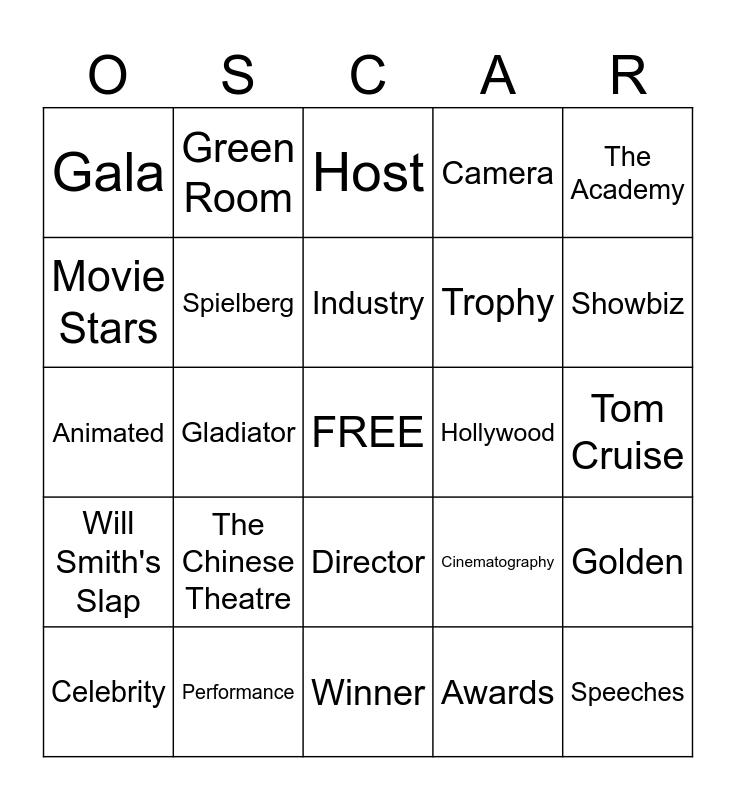 This bingo card has a free space and 39 words: Lady Gaga, Lights, Camera Action, Producer, Cinematography, Golden, Will Smith's Slap, Gladiator, Red Carpet, Hollywood, Tom Cruise, Movie Stars, Green Room, John Williams, Showbiz, Animated, The Chinese Theatre, Director, Camera, Stunts, Celebrity, Spielberg, Industry, Awards, The Academy, Stage, Performance, Winner, Brad Pitt, Tom Hanks, Gala, Paramount, Actor, Trophy, Speeches, LA, Costumes, Host, Monologue and Nominees.