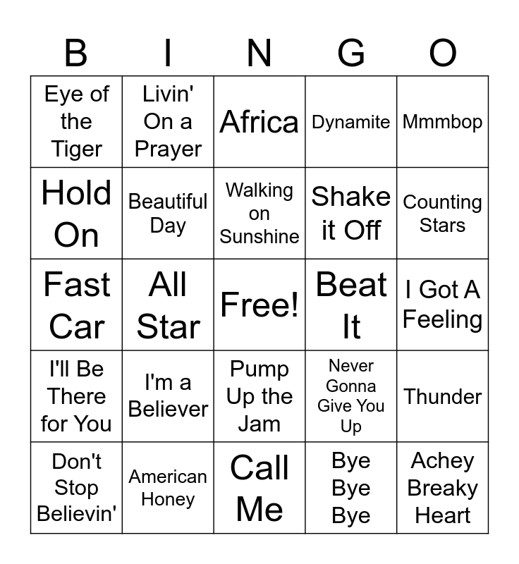 This bingo card has a free space and 55 words: The Final Countdown, Don't Stop Believin', Everybody Wants to Rule the World, Eye of the Tiger, Call Me, Get This Party Started, Beautiful Day, Can't Stop the Feeling, Shake it Off, Life is a Highway, Dynamite, Firework, Party in the USA, Best Day of my Life, Baby Shark, YMCA, Mmmbop, All Star, Macarena, Achey Breaky Heart, Beat It, Friends in Low Places, Never Gonna Give You Up, Africa, I Wanna Dance with Somebody, Walking on Sunshine, Bye Bye Bye, Waterfalls, I Got A Feeling, Thunder, Kiss Me, Happy, Roar, Believer, Hold On, Fast Car, Jump, I'll Be There for You, Girls Just wanna have Fun, Hey Soul Sister, Livin' On a Prayer, Just Dance, We Will Rock You, Take On Me, I'm a Believer, American Honey, Summertime, Mountain Music, Forever and Ever Amen, Counting Stars, Wake Me Up, U Can't Touch This, Cupid Shuffle, Pump Up the Jam and Watch Me (Whip/ Nae Nae).