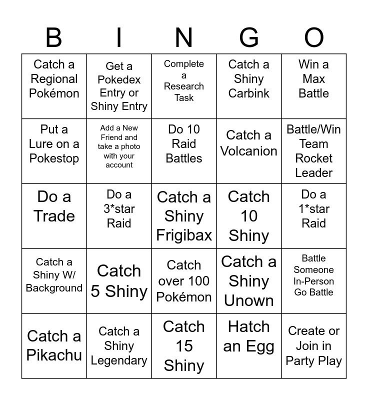 This bingo card has a free space and 24 words: Catch a Pikachu, Catch 5 Shiny, Do 10 Raid Battles, Hatch an Egg, Win a Max Battle, Catch a Regional Pokémon, Get a Pokedex Entry or Shiny Entry, Complete a Research Task, Catch 10 Shiny, Do a 1*star Raid, Do a Trade, Add a New Friend and take a photo with your account, Catch a Shiny Unown, Battle Someone In-Person Go Battle, Put a Lure on a Pokestop, Catch a Shiny Legendary, Catch 15 Shiny, Catch a Shiny Carbink, Battle/Win Team Rocket Leader, Catch a Shiny W/ Background, Do a 3*star Raid, Catch over 100 Pokémon, Catch a Volcanion and Create or Join in Party Play.