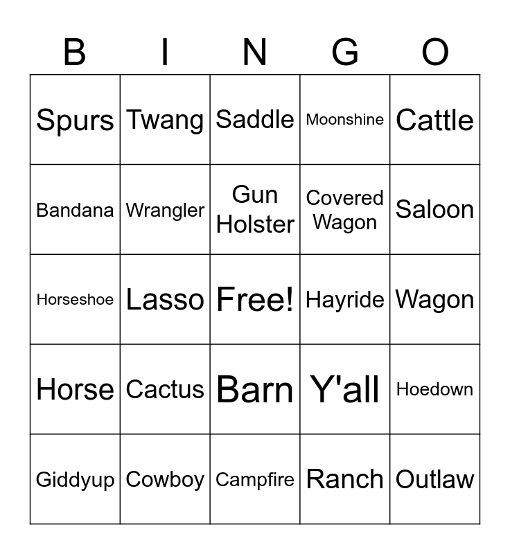 This bingo card has a free space and 30 words: Cowboy, Rodeo, Lasso, Boots, Spurs, Saddle, Wrangler, Barn, Hayride, Campfire, Wagon, Outlaw, Ranch, Trail, Saloon, Fiddle, Y'all, Horse, Cactus, Cattle, Horseshoe, Dusty, Twang, Covered Wagon, Bandana, Moonshine, Hoedown, Giddyup, Gun Holster and El Vaquero.
