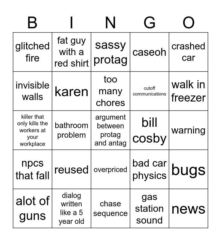 This bingo card has 25 words: reused, chase sequence, too many chores, alot of guns, crashed car, glitched fire, invisible walls, fat guy with a red shirt, bill cosby, overpriced, cutoff communications, killer that only kills the workers at your workplace, bad car physics, bugs, karen, news, warning, sassy protag, walk in freezer, bathroom problem, argument between protag and antag, dialog written like a 5 year old, npcs that fall, caseoh and gas station sound.