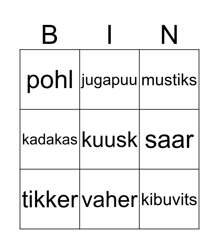 This bingo card has a free space and 8 words: saar, mustiks, jugapuu, tikker, pohl, kibuvits, kadakas and vaher.