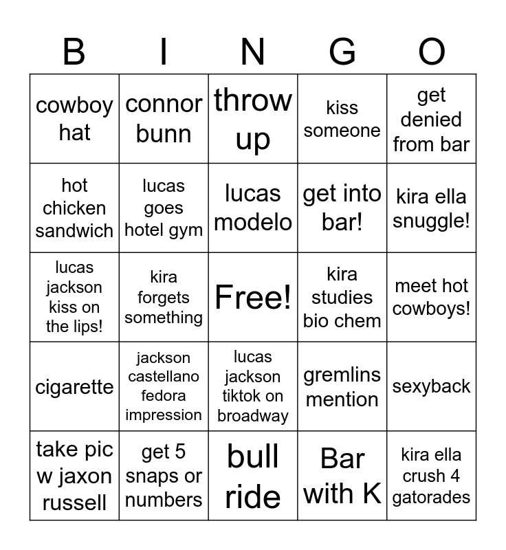 This bingo card has a free space and 25 words: jackson castellano fedora impression, bull ride, lucas modelo, take pic w jaxon russell, get denied from bar, cowboy hat, hot chicken sandwich, connor bunn, kira studies bio chem, lucas jackson tiktok on broadway, get into bar!, lucas jackson kiss on the lips!, gremlins mention, sexyback, lucas goes hotel gym, finish wine bag night one, meet hot cowboys!, throw up, kira ella snuggle!, kira forgets something, kira ella crush 4 gatorades, get 5 snaps or numbers, cigarette, kiss someone and Bar with K.