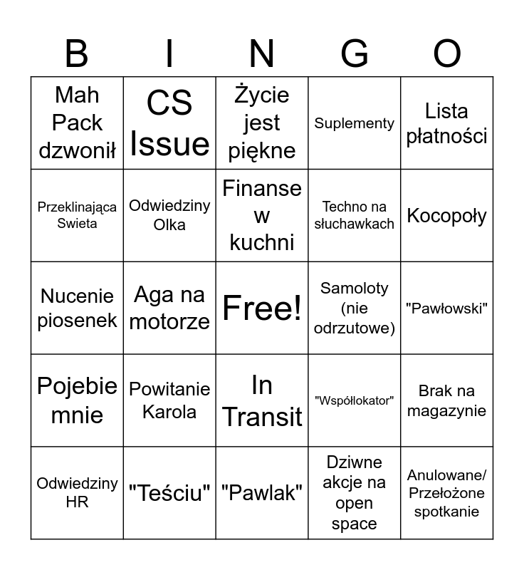 This bingo card has a free space and 24 words: Powitanie Karola, "Teściu", Finanse w kuchni, Odwiedziny HR, Lista płatności, Mah Pack dzwonił, Przeklinająca Swieta, CS Issue, Samoloty (nie odrzutowe), In Transit, Techno na słuchawkach, Nucenie piosenek, "Współlokator", Brak na magazynie, Odwiedziny Olka, Dziwne akcje na open space, "Pawłowski", Życie jest piękne, Kocopoły, Aga na motorze, Anulowane/ Przełożone spotkanie, Pojebie mnie, Suplementy and "Pawlak".