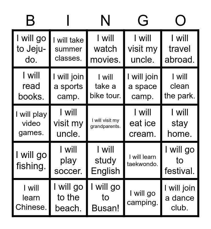 This bingo card has 25 words: I will go fishing., I will go to the beach., I will visit my grandparents., I will go camping., I will travel abroad., I will go to Jeju-do., I will take summer classes., I will watch movies., I will eat ice cream., I will go to festival., I will read books., I will join a sports camp., I will go to Busan!, I will learn taekwondo., I will clean the park., I will learn Chinese., I will visit my uncle., I will take a bike tour., I will join a space camp., I will stay home., I will play video games., I will play soccer., I will study English, I will visit my uncle. and I will join a dance club..