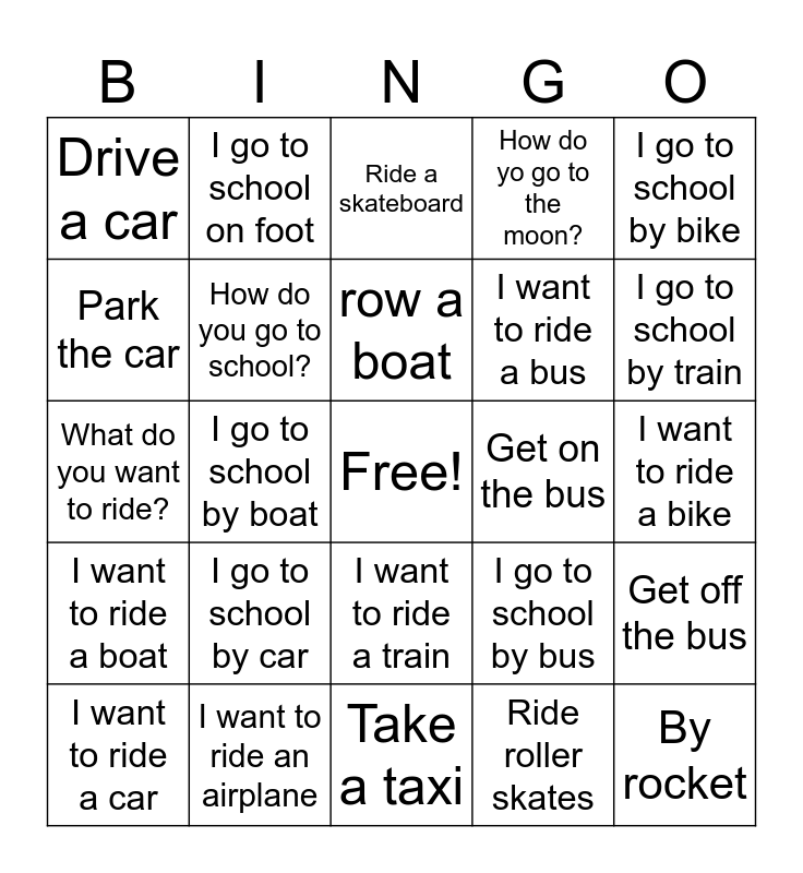 This bingo card has a free space and 24 words: I go to school by car, I want to ride an airplane, row a boat, I want to ride a car, I go to school by bike, Drive a car, Park the car, I go to school on foot, Get on the bus, I want to ride a train, I want to ride a bus, What do you want to ride?, I go to school by bus, Get off the bus, How do you go to school?, Ride roller skates, I want to ride a bike, Ride a skateboard, I go to school by train, I go to school by boat, By rocket, I want to ride a boat, How do yo go to the moon? and Take a taxi.