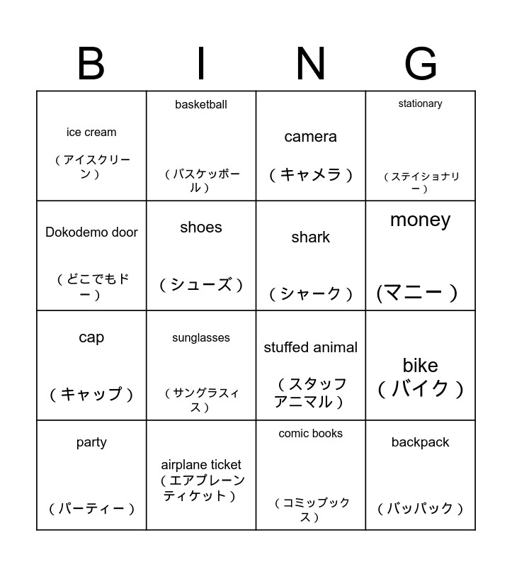 This bingo card has 16 words: airplane ticket (エアプレーン ティケット), bike (バイク), camera (キャメラ), ice cream (アイスクリーン), cap (キャップ), basketball (バスケッボール), stuffed animal (スタッフ アニマル), comic books (コミッブックス), Dokodemo door (どこでもドー), shoes (シューズ), party (パーティー), stationary (ステイショナリー), sunglasses (サングラスィス), money (マニー), shark (シャーク) and backpack (バッパック).