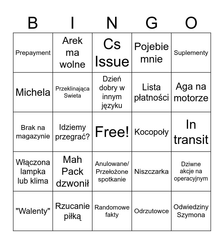 This bingo card has a free space and 24 words: "Walenty", Mah Pack dzwonił, Dzień dobry w innym języku, Odrzutowce, Suplementy, Prepayment, Arek ma wolne, Cs Issue, Kocopoły, In transit, Brak na magazynie, Przeklinająca Swieta, Niszczarka, Dziwne akcje na operacyjnym, Michela, Rzucanie piłką, Randomowe fakty, Pojebie mnie, Aga na motorze, Włączona lampka lub klima, Idziemy przegrać?, Anulowane/ Przełożone spotkanie, Lista płatności and Odwiedziny Szymona.