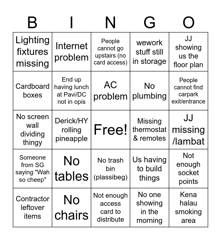 This bingo card has a free space and 24 words: No tables, No chairs, AC problem, Contractor leftover items, JJ showing us the floor plan, Lighting fixtures missing, Cardboard boxes, Internet problem, Missing thermostat & remotes, No trash bin (plassibeg), No plumbing, No screen wall dividing thingy, Us having to build things, Not enough socket points, End up having lunch at Pavi/DC not in opis, No one showing in the morning, JJ missing /lambat, People cannot go upstairs (no card access), People cannot find carpark exit/entrance, Derick/HY rolling pineapple, Kena halau smoking area, Someone from SG saying "Wah so cheep", wework stuff still in storage and Not enough access card to distribute.