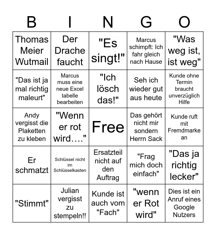 This bingo card has a free space and 24 words: Schlüssel nicht im Schlüsselkasten, Julian vergisst zu stempeln!!, "Ich lösch das!", "Stimmt", "Was weg ist, ist weg", Thomas Meier Wutmail, "Das ist ja mal richtig maleurt", Der Drache faucht, Das gehört nicht mir sondern Herrn Sack, Ersatzteil nicht auf den Auftrag, Seh ich wieder gut aus heute, Andy vergisst die Plaketten zu kleben, "Frag mich doch einfach", "Das ja richtig lecker", Marcus muss eine neue Excel tabelle bearbeiten, "wenn er Rot wird", Kunde ruft mit Fremdmarke an, "Es singt!", Kunde ohne Termin braucht unverzüglich Hilfe, "Wenn er rot wird….", Dies ist ein Anruf eines Google Nutzers, Er schmatzt, Marcus schimpft: Ich fahr gleich nach Hause and Kunde ist auch vom "Fach".