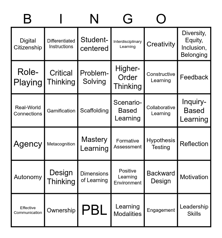 This bingo card has 42 words: Engagement, Critical Thinking, Active Learning, Collaborative Learning, Reflection, Metacognition, Real-World Connections, Growth Mindset, Student-centered, Inquiry-Based Learning, Scaffolding, Higher-Order Thinking, Feedback, Creativity, Ownership, Agency, Motivation, Constructive Learning, Leadership Skills, Differentiated Instructions, Diversity, Equity, Inclusion, Belonging, Dimensions of Learning, Autonomy, Digital Citizenship, SEL, Effective Communication, Problem-Solving, Goal-Oriented, Design Thinking, Backward Design, Authentic Performance Tasks, Scenario-Based Learning, Role-Playing, Hypothesis Testing, PBL, Mastery Learning, Formative Assessment, Gamification, Positive Learning Environment, Learning Modalities, Interdisciplinary Learning and Holistic Learning.