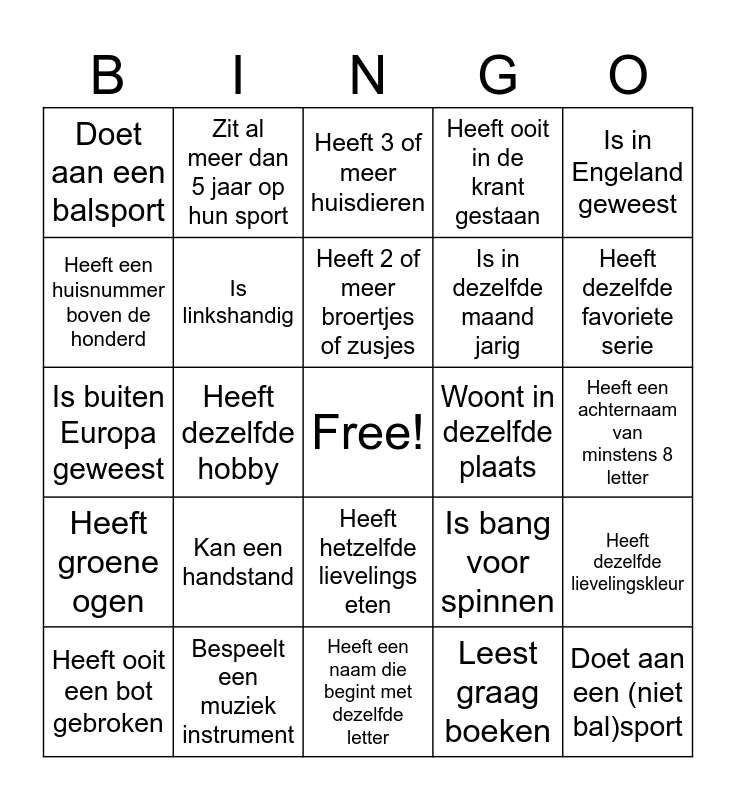 This bingo card has a free space and 24 words: Kan een handstand, Bespeelt een muziek instrument, Heeft 2 of meer broertjes of zusjes, Heeft ooit een bot gebroken, Is in Engeland geweest, Doet aan een balsport, Heeft een huisnummer boven de honderd, Zit al meer dan 5 jaar op hun sport, Woont in dezelfde plaats, Heeft hetzelfde lievelings eten, Is in dezelfde maand jarig, Is buiten Europa geweest, Is bang voor spinnen, Heeft dezelfde lievelingskleur, Is linkshandig, Leest graag boeken, Heeft een achternaam van minstens 8 letter, Heeft 3 of meer huisdieren, Heeft dezelfde favoriete serie, Heeft dezelfde hobby, Doet aan een (niet bal)sport, Heeft groene ogen, Heeft ooit in de krant gestaan and Heeft een naam die begint met dezelfde letter.