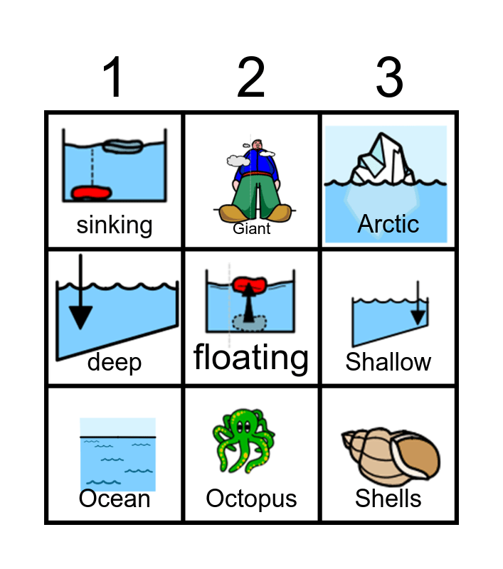 This bingo card has 9 images and 9 words: Ocean, Arctic, Giant, deep, sinking, Shallow, floating, Shells and Octopus.