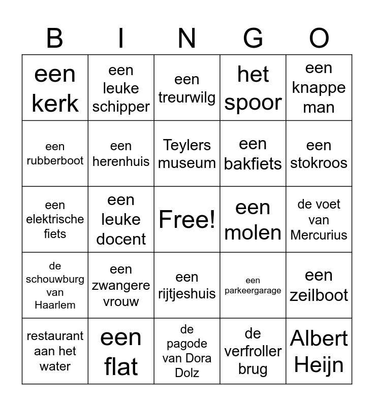 This bingo card has a free space and 24 words: een zwangere vrouw, een flat, Teylers museum, restaurant aan het water, een knappe man, een kerk, een rubberboot, een leuke schipper, een molen, een rijtjeshuis, een bakfiets, een elektrische fiets, een parkeergarage, een zeilboot, een herenhuis, de verfroller brug, de voet van Mercurius, een treurwilg, een stokroos, een leuke docent, Albert Heijn, de schouwburg van Haarlem, het spoor and de pagode van Dora Dolz.