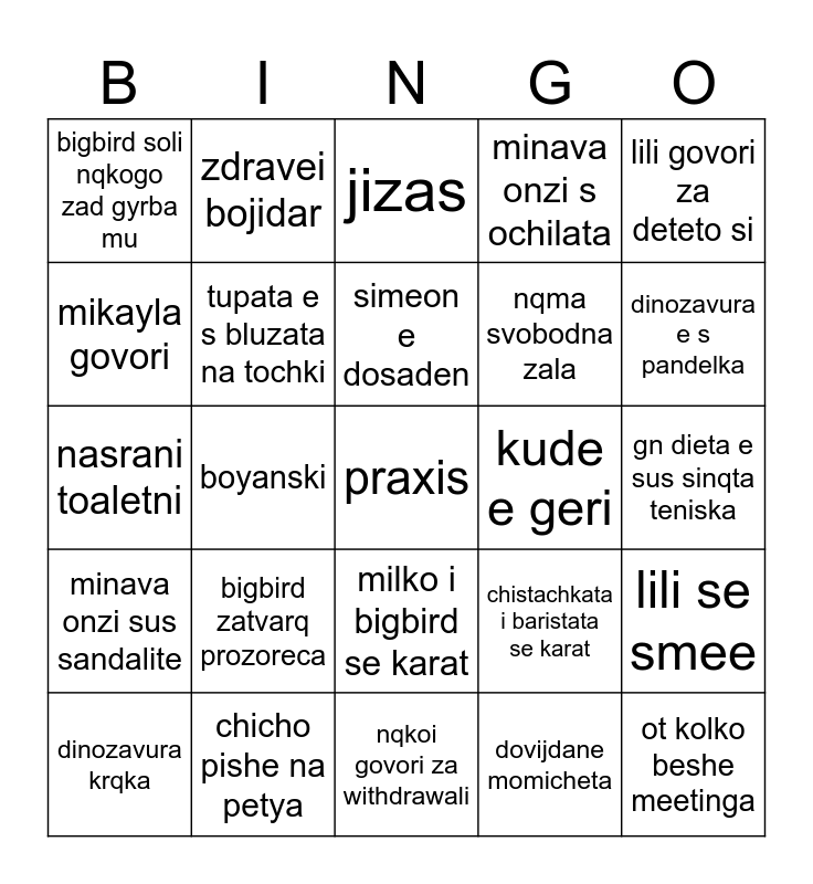 This bingo card has a free space and 24 words: bigbird zatvarq prozoreca, chicho pishe na petya, simeon e dosaden, dinozavura krqka, lili govori za deteto si, bigbird soli nqkogo zad gyrba mu, mikayla govori, zdravei bojidar, kude e geri, milko i bigbird se karat, nqma svobodna zala, nasrani toaletni, chistachkata i baristata se karat, lili se smee, tupata e s bluzata na tochki, dovijdane momicheta, gn dieta e sus sinqta teniska, jizas, dinozavura e s pandelka, boyanski, ot kolko beshe meetinga, minava onzi sus sandalite, minava onzi s ochilata and nqkoi govori za withdrawali.