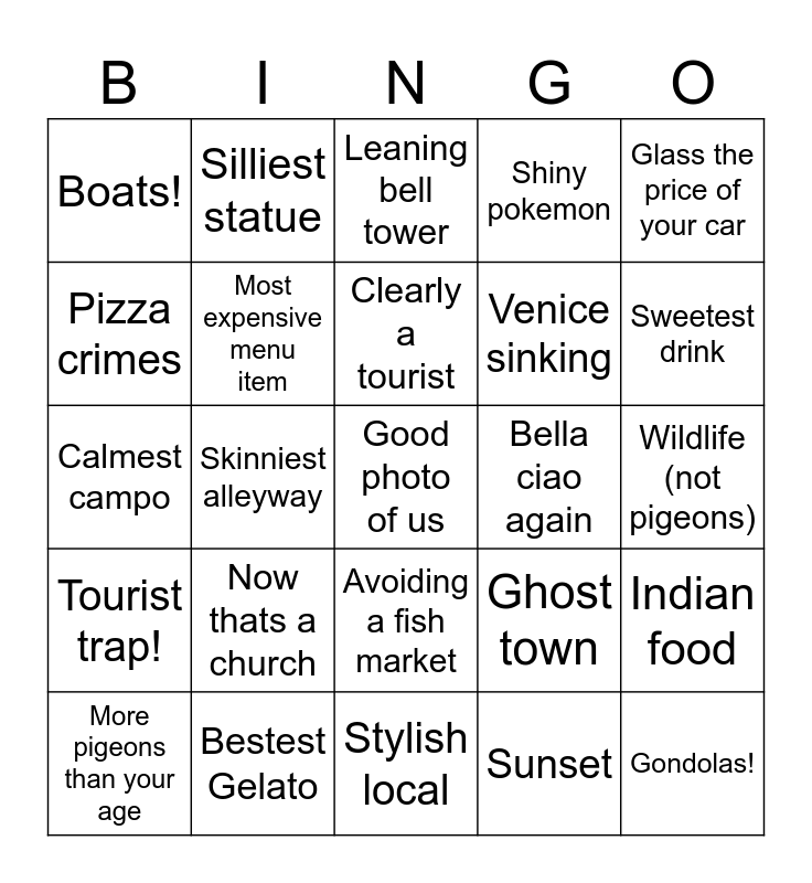This bingo card has a free space and 24 words: Now thats a church, Bestest Gelato, Clearly a tourist, More pigeons than your age, Glass the price of your car, Boats!, Pizza crimes, Silliest statue, Bella ciao again, Avoiding a fish market, Venice sinking, Calmest campo, Ghost town, Indian food, Most expensive menu item, Sunset, Wildlife (not pigeons), Leaning bell tower, Sweetest drink, Skinniest alleyway, Gondolas!, Tourist trap!, Shiny pokemon and Stylish local.