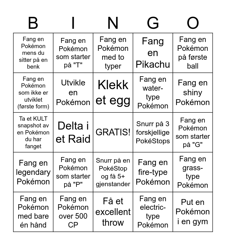 This bingo card has a free space and 24 words: Fang en Pokémon som starter på "P", Fang en Pokémon over 500 CP, Klekk et egg, Fang en Pokémon med bare én hånd, Fang en Pokémon på første ball, Fang en Pokémon mens du sitter på en benk, Fang en Pokémon som ikke er utviklet (første form), Fang en Pokémon som starter på "T", Snurr på 3 forskjellige PokéStops, Snurr på en PokéStop og få 5+ gjenstander, Fang en water-type Pokémon, Ta et KULT snapshot av en Pokémon du har fanget, Fang en fire-type Pokémon, Fang en grass-type Pokémon, Utvikle en Pokémon, Fang en electric-type Pokémon, Fang en Pokémon som starter på "G", Fang en Pokémon med to typer, Fang en shiny Pokémon, Delta i et Raid, Put en Pokémon i en gym, Fang en legendary Pokémon, Fang en Pikachu and Få et excellent throw.