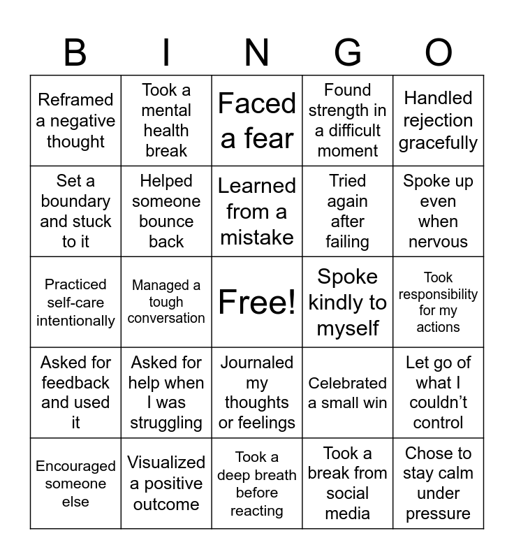 This bingo card has a free space and 25 words: Asked for help when I was struggling, Took a deep breath before reacting, Learned from a mistake, Encouraged someone else, Handled rejection gracefully, Reframed a negative thought, Set a boundary and stuck to it, Took a mental health break, Spoke kindly to myself, Journaled my thoughts or feelings, Tried again after failing, Practiced self-care intentionally, Celebrated a small win, Let go of what I couldn’t control, Helped someone bounce back, Practiced gratitude, Took responsibility for my actions, Faced a fear, Spoke up even when nervous, Managed a tough conversation, Chose to stay calm under pressure, Visualized a positive outcome, Asked for feedback and used it, Found strength in a difficult moment and Took a break from social media.