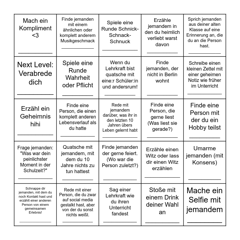 This bingo card has a free space and 24 words: Quatsche mit jemandem, mit dem du 10 Jahre nichts zu tun hattest ___________, Rede mit einer Person, die du zwar auf social media gestalkt hast, aber von der du sonst nichts weißt. _____________, Wenn du Lehrkraft bist quatsche mit eine:r Schüler:in und andersrum! ___________, Schnappe dir jemanden, mit dem du noch Kontakt hast und erzählt einer anderen Person von einem gemeinsamen Erlebnis! _________________, Sprich jemanden aus deiner alten Klasse auf eine Erinnerung an, die du an die Person hast. _____________, Mach ein Kompliment <3 __________, Next Level: Verabrede dich _________, Finde jemanden mit einem ähnlichen oder komplett anderem Musikgeschmack _____________, Finde eine Person, die gerne liest (Was liest sie gerade?) ___________, Finde jemanden der gerne feiert. (Wo war die Person zuletzt?) ____________, Finde jemanden, der nicht in Berlin wohnt ___________, Erzähl ein Geheimnis hihi __________, Erzähle einen Witz oder lass dir einen Witz erzählen ____________, Umarme jemanden (mit Konsens) __________, Spiele eine Runde Wahrheit oder Pflicht _________, Stoße mit einem Drink deiner Wahl an __________, Finde eine Person mit der du ein Hobby teilst _________, Spiele eine Runde Schnick-Schnack-Schnuck ____________, Schreibe einen kleinen Zettel mit einer geheimen Notiz wie früher im Unterricht _____________, Finde eine Person, die einen komplett anderen Lebensverlauf als du hatte _____________, Mache ein Selfie mit jemandem ________, Frage jemanden: "Was war dein peinlichster Moment in der Schulzeit?" _____________, Erzähle jemandem in den du heimlich verliebt warst davon ___________ and Sag einer Lehrkraft wie du ihren Unterricht fandest ____________.