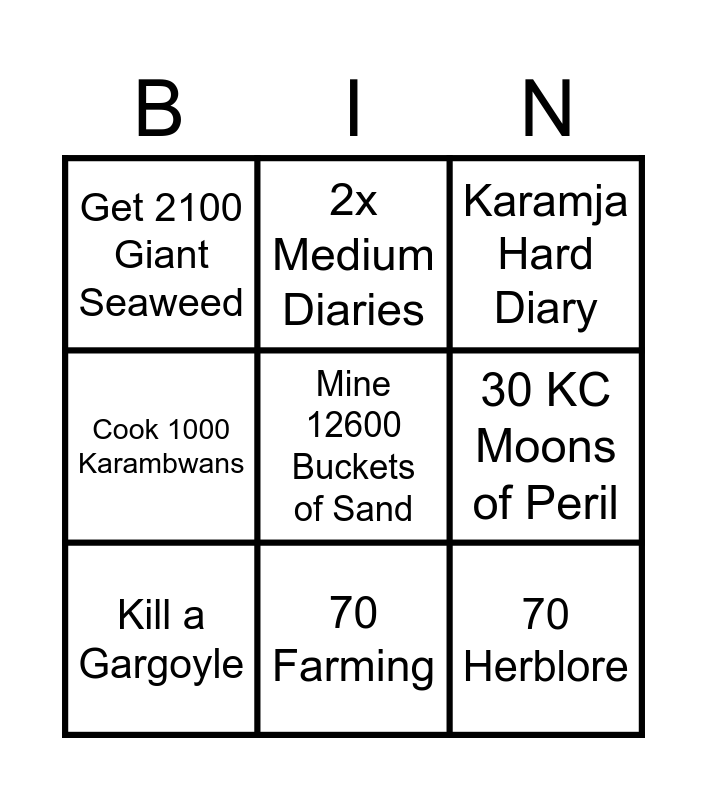 This bingo card has a free space and 8 words: 30 KC Moons of Peril, Karamja Hard Diary, 2x Medium Diaries, Kill a Gargoyle, Get 2100 Giant Seaweed, 70 Herblore, Cook 1000 Karambwans and 70 Farming.