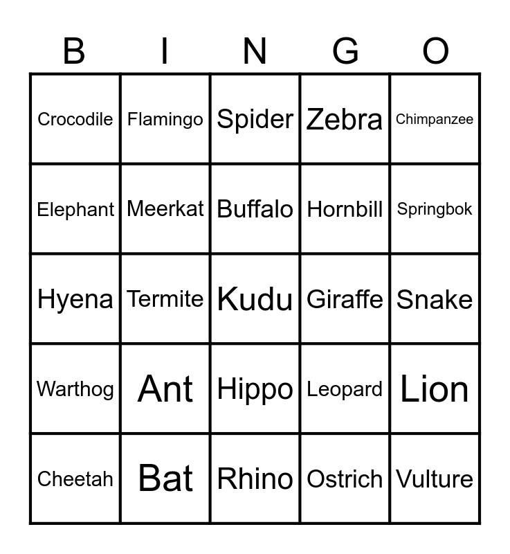 This bingo card has a free space and 24 words: Ant, Bat, Buffalo, Cheetah, Chimpanzee, Crocodile, Elephant, Flamingo, Giraffe, Hippo, Hornbill, Hyena, Leopard, Lion, Meerkat, Ostrich, Snake, Spider, Springbok, Termite, Vulture, Warthog, Zebra and Rhino.