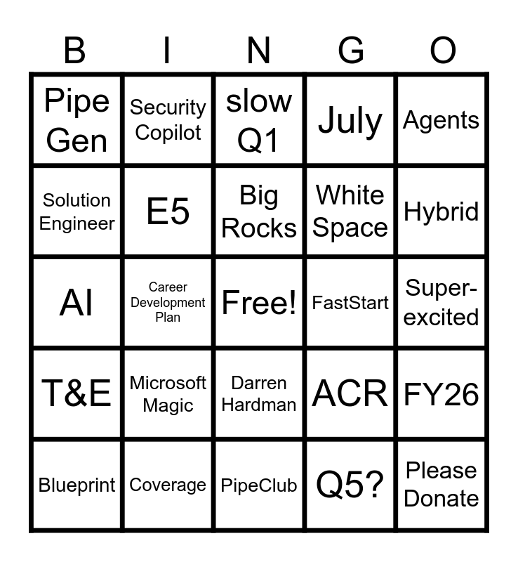 This bingo card has a free space and 24 words: Microsoft Magic, Coverage, Big Rocks, Blueprint, Agents, Pipe Gen, Solution Engineer, Security Copilot, FastStart, Darren Hardman, White Space, AI, ACR, FY26, E5, Q5?, Super-excited, slow Q1, Hybrid, Career Development Plan, Please Donate, T&E, July and PipeClub.