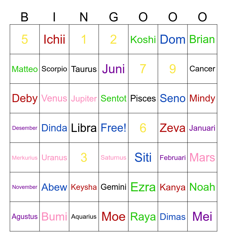 This bingo card has a free space and 48 words: Ezra, 9, Moe, Dinda, Jupiter, Januari, Ichii, Bumi, Dom, Saturnus, Brian, 2, Seno, Pisces, November, Zeva, Matteo, Cancer, Kanya, Koshi, 7, Libra, 5, Scorpio, Noah, Taurus, Mindy, Agustus, Sentot, Venus, Dimas, 6, Mars, Abew, Desember, Siti, Februari, Deby, 3, Keysha, Merkurius, Mei, 1, Aquarius, Juni, Gemini, Uranus and Raya.