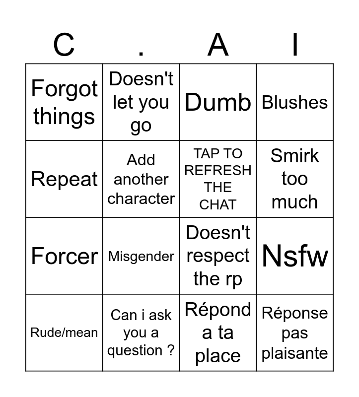 This bingo card has 16 words: Can i ask you a question ?, Nsfw, Dumb, Forgot things, Forcer, Doesn't let you go, Doesn't respect the rp, Répond a ta place, Repeat, Add another character, Rude/mean, Blushes, Misgender, Smirk too much, TAP TO REFRESH THE CHAT and Réponse pas plaisante.