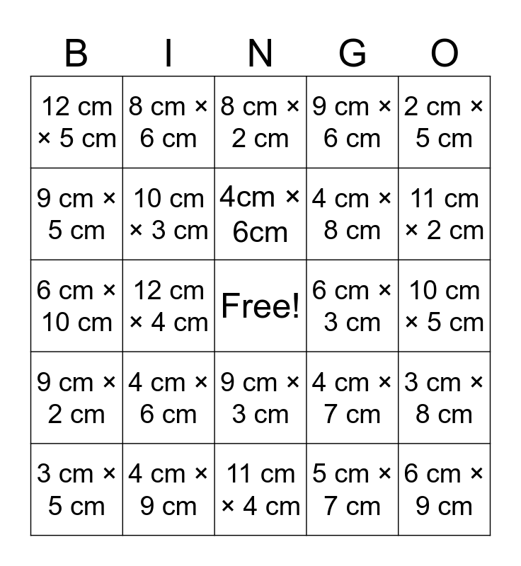 This bingo card has 1 images, a free space and 42 words: 2cm × 3cm, 4cm × 6cm, 2 cm × 3 cm, 4 cm × 6 cm, 5 cm × 7 cm, 3 cm × 8 cm, 6 cm × 9 cm, 7 cm × 4 cm, 8 cm × 2 cm, 9 cm × 3 cm, 10 cm × 5 cm, 11 cm × 2 cm, 12 cm × 4 cm, 2 cm × 5 cm, 3 cm × 6 cm, 4 cm × 7 cm, 5 cm × 8 cm, 6 cm × 10 cm, 7 cm × 3 cm, 8 cm × 6 cm, 9 cm × 5 cm, 10 cm × 2 cm, 11 cm × 3 cm, 12 cm × 5 cm, 2 cm × 7 cm, 3 cm × 9 cm, 4 cm × 8 cm, 5 cm × 6 cm, 6 cm × 4 cm, 7 cm × 6 cm, 8 cm × 5 cm, 9 cm × 2 cm, 10 cm × 3 cm, 11 cm × 4 cm, 12 cm × 2 cm, 3 cm × 5 cm, 4 cm × 9 cm, 6 cm × 3 cm, 7 cm × 2 cm, 8 cm × 4 cm, 9 cm × 6 cm and 12 cm × 3 cm.