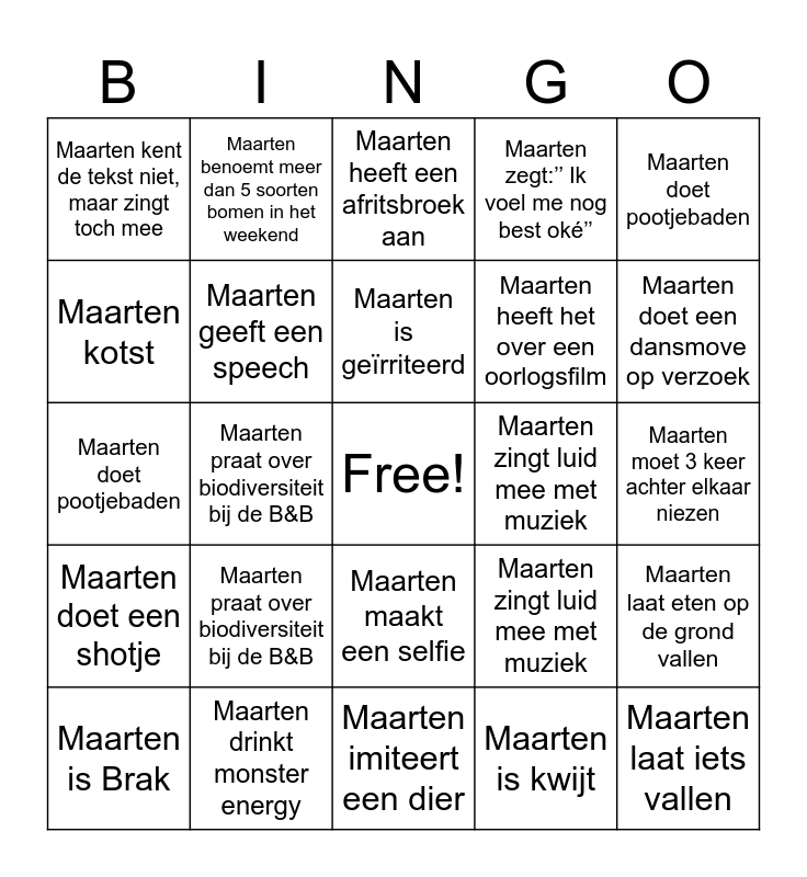 This bingo card has a free space and 105 words: Maarten doet een Shotje, Maarten zegt iets over dat het nog licht is op een laat tijdstip, Maarten doet pootjebaden, Maarten laat weten dat Bennekom de beste is, Maarten maakt een slechte woordgrap, Maarten begint Spaans te praten, Maarten staat op meubilair, Maarten raakt verwond, Maarten doet een Shotje, Maarten belt met zijn Willemijn/zijn ouders, Maarten geeft een speech, Maarten verliest een weddenschap, Maarten vraagt 21 pilots, Ed Sheeran, of de outkast aan, Maarten loopt rond in zijn onderbroek, Maarten verbrand zich, Maarten probeert iemand te overtuigen tot zwemmen, Maarten heeft een afritsbroek aan, Maarten wint met een drankspel, Maarten verliest zijn slipper(s), Maarten maakt een selfie, Maarten geeft een high-five aan iemand, Maarten laat eten op de grond vallen, Maarten tyft in het water, Maarten imiteert een dier, Maarten benoemt meer dan 5 soorten bomen in het weekend, Maarten praat over biodiversiteit bij de B&B, Maarten doet een dansmove op verzoek, Maarten zegt:’’ Ik voel me nog best oké’’, Maarten is nog wakker na 3u s ’avonds, Maarten schopt iets weg, Maarten zingt luid mee met muziek, Maarten is kwijt, Maarten imiteert een van zijn vrienden, Maarten verklaard de liefde, Maarten praat over zijn werk, Maarten vraagt om koffie, Maarten loopt rond in zijn blote bast, Maarten zegt:‘’ik heb wel trek’’, Maarten is geïrriteerd, Maarten drinkt monster energy, Maarten praat over lord of the rings, Maarten doet een shotje, Maarten gaat voor langer dan 8 minuten naar de WC, Maarten kotst, Maarten heeft het over houtbewerking, Maarten kent de tekst niet, maar zingt toch mee, Maarten zegt dat hij ‘’vanille’’ proeft in whisky, Maarten laat iets vallen, Maarten is Brak, Maarten geeft iemand een spontane knuffel, Maarten maakt een selfie, Maarten loopt rond in zijn blote bast, Maarten zegt: “wacht ik heb een idee’’, en loopt weg., Maarten laat drank over zichzelf knoeien, Maarten verliest zijn slipper(s), Maarten steekt een vuurtje aan, Maarten doet een dansmove op verzoek, Maarten verliest een weddenschap, Maarten imiteert een Belg, Maarten maakt een selfie, Maarten moet 3 keer achter elkaar niezen, Maarten heeft het over Willemijn, Maarten probeert iemand te overtuigen tot zwemmen, Maarten vraagt om koffie, Maarten heeft het over een oorlogsfilm, Maarten wordt ingemaakt bij een drankspel, Maarten valt, Maarten benoemt meer dan 5 soorten bomen in het weekend, Maarten doet pootjebaden, Maarten praat over biodiversiteit bij de B&B, Maarten imiteert een dier, Maarten maakt een selfie, Maarten drinkt monster energy, Maarten verklaard de liefde, Maarten vraagt om koffie, Maarten wint met een drankspel, Maarten doet een dansmove op verzoek, Maarten loopt rond in zijn onderbroek, Maarten is Brak, Maarten begint Spaans te praten, Maarten probeert iemand te overtuigen tot zwemmen, Maarten vraagt 21 pilots, Ed Sheeran, of de outkast aan, Maarten kent de tekst niet, maar zingt toch mee, Maarten geeft een speech, Maarten belt met zijn Willemijn/zijn ouders, Maarten zingt luid mee met muziek, Maarten valt, Maarten maakt een slechte woordgrap, Maarten stoot zijn teen, Maarten imiteert een van zijn vrienden, Maarten heeft een zonnebril én een pet op, Maarten plukt een plantje, Maarten heeft het over Scandinavië, Maarten laat weten dat Bennekom de beste is, Maarten laat eten op de grond vallen, Maarten praat over zijn werk, Maarten tyft in het water, Maarten heeft het over Willemijn, Maarten heeft het over een oorlogsfilm, Maarten verbrand zich, Maarten zegt dat hij ‘’vanille’’ proeft in whisky, Maarten benoemt meer dan 5 soorten bomen in het weekend, Maarten loopt rond in zijn blote bast, Maarten probeert iemand te overtuigen tot zwemmen and Maarten wint met een drankspel.