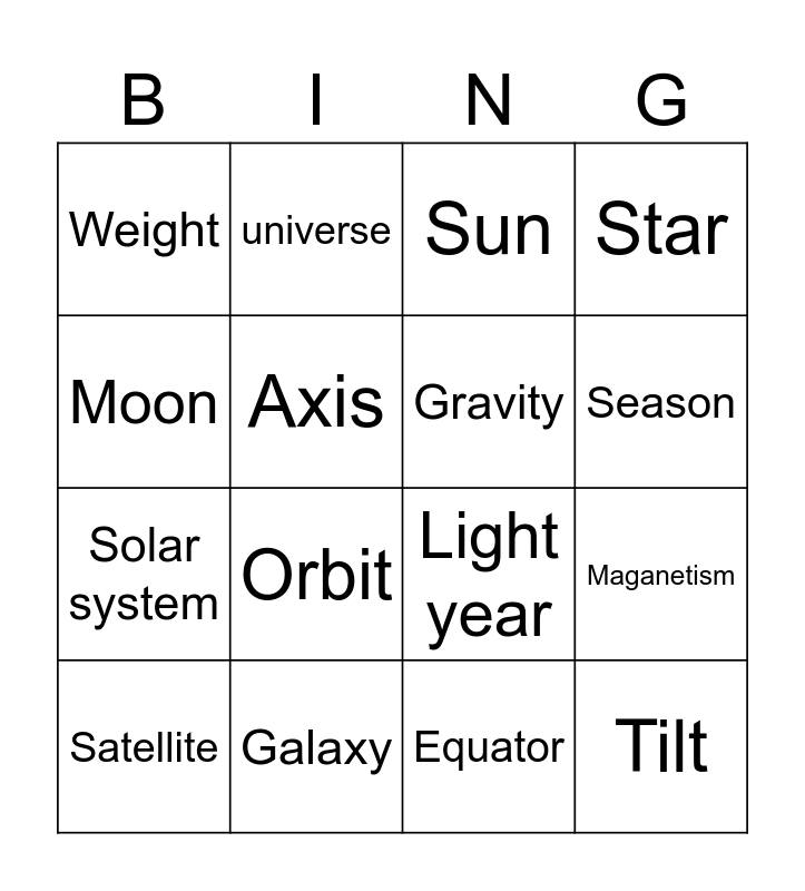 This bingo card has 16 words: Galaxy, Maganetism, Sun, Weight, Solar system, universe, Light year, Equator, Moon, Axis, Satellite, Star, Orbit, Season, Gravity and Tilt.