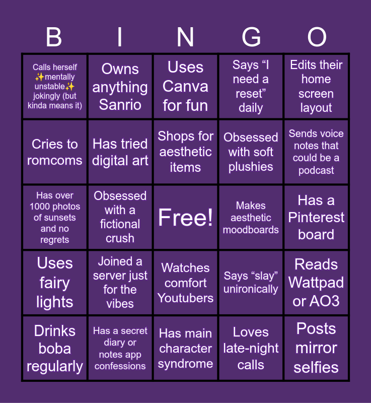 This bingo card has a free space and 24 words: Drinks boba regularly, Joined a server just for the vibes, Shops for aesthetic items, Loves late-night calls, Edits their home screen layout, Calls herself ✨mentally unstable✨ jokingly (but kinda means it), Owns anything Sanrio, Uses Canva for fun, Makes aesthetic moodboards, Has a Pinterest board, Has over 1000 photos of sunsets and no regrets, Has tried digital art, Says “slay” unironically, Reads Wattpad or AO3, Cries to romcoms, Has a secret diary or notes app confessions, Has main character syndrome, Says “I need a reset” daily, Sends voice notes that could be a podcast, Uses fairy lights, Obsessed with a fictional crush, Watches comfort Youtubers, Obsessed with soft plushies and Posts mirror selfies.
