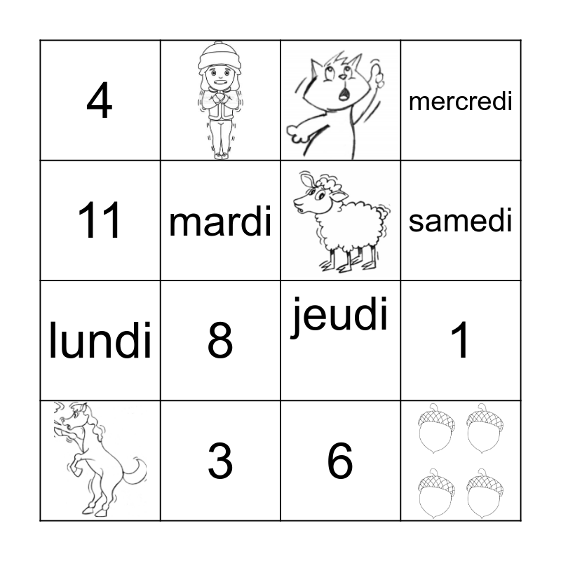 This bingo card has 13 images and 18 words: 1, 2, 4, 5, 3, 6, 7, 8, 9, 10, 11, lundi, mardi, mercredi, jeudi, vendredi, samedi and dimanche.