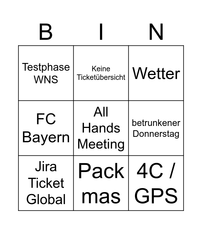 This bingo card has a free space and 8 words: betrunkener Donnerstag, Wetter, Keine Ticketübersicht, Jira Ticket Global, Testphase WNS, 4C / GPS, FC Bayern and Pack mas.