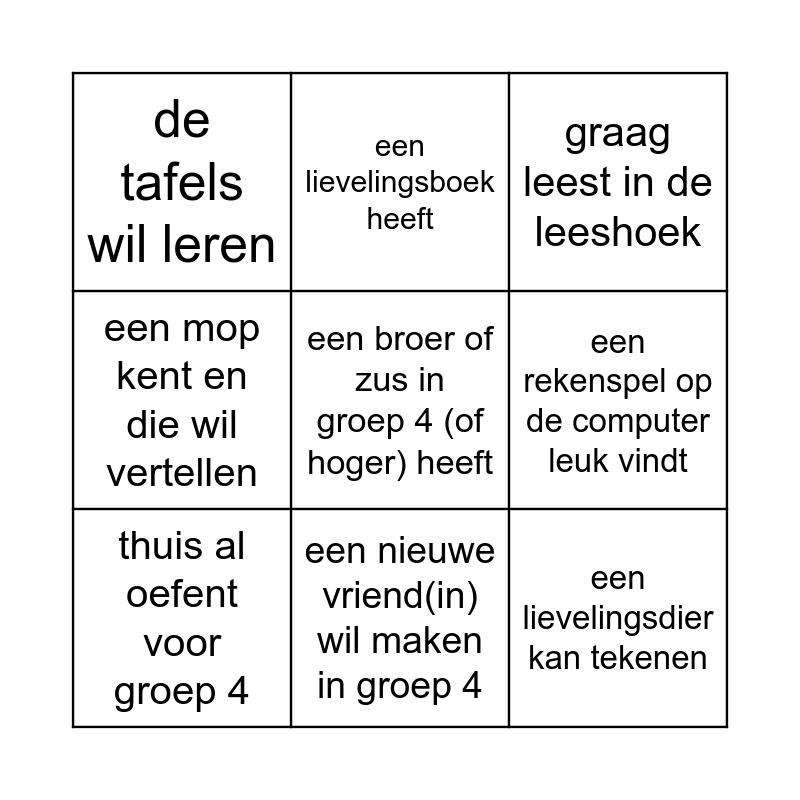 This bingo card has a free space and 16 words: kan tellen tot 100, al zin heeft in groep 4, graag leest in de leeshoek, de tafels wil leren, het leuk vindt om sommen te maken, een lievelingsboek heeft, de juf of meester van groep 4 al kent, het alfabet kan opzeggen, een lievelingsdier kan tekenen, een rekenspel op de computer leuk vindt, graag samenwerkt in groepjes, een mop kent en die wil vertellen, heel netjes kan schrijven, een nieuwe vriend(in) wil maken in groep 4, thuis al oefent voor groep 4 and vandaag met een glimlach naar school kwam 😊.