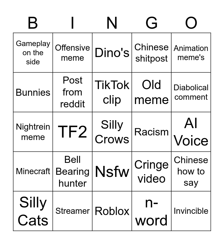 This bingo card has a free space and 24 words: Bell Bearing hunter, Streamer, TikTok clip, Silly Cats, Animation meme's, Gameplay on the side, Bunnies, Offensive meme, Racism, Nsfw, Old meme, Nightrein meme, Cringe video, Chinese how to say, Post from reddit, n-word, AI Voice, Dino's, Diabolical comment, TF2, Invincible, Minecraft, Chinese shitpost and Roblox.