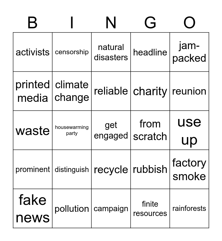 This bingo card has a free space and 24 words: distinguish, pollution, reliable, fake news, jam-packed, activists, printed media, censorship, from scratch, recycle, charity, waste, rubbish, factory smoke, climate change, finite resources, use up, natural disasters, reunion, housewarming party, rainforests, prominent, headline and campaign.