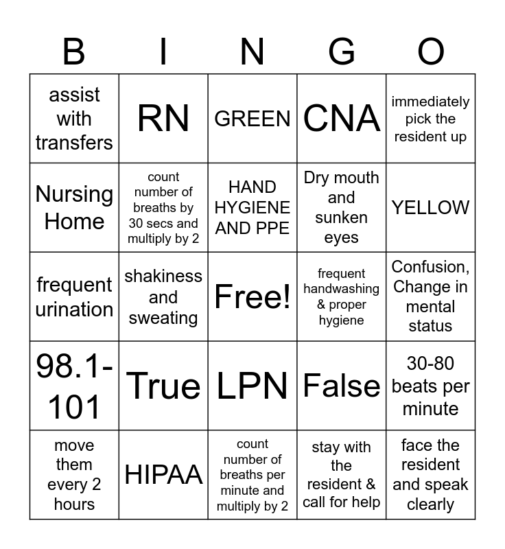 This bingo card has a free space and 29 words: 60-100 beats per minute, HIPAA, GREEN, 97.8-99.1, immediately pick the resident up, assist with transfers, count number of breaths by 30 secs and multiply by 2, HAND HYGIENE AND PPE, frequent handwashing & proper hygiene, 30-80 beats per minute, move them every 2 hours, shakiness and sweating, stay with the resident & call for help, face the resident and speak clearly, frequent urination, providing direct patient care and assistance, count number of breaths per minute and multiply by 2, False, YELLOW, 98.1-101, True, outline the residents care needs and goals, Dry mouth and sunken eyes, Confusion, Change in mental status, Nursing Home, RN, LPN, CNA and Hospital.