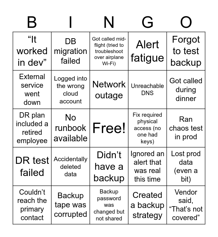 This bingo card has a free space and 67 words: Restored from backup, Woke up midnight to standby call, Ran a DR stimulation game, Lost prod data (even a bit), Wrote a DR plan no one read, Deployment broke prod, DB migration failed, Alert false positive, Network outage, Practiced failover, Didn’t have a backup, Cloud region down, Ran chaos test in prod, Forgot to test backup, Oncall during a holiday, External service went down, No runbook available, “It worked in dev”, Did a post-mortem, Unreachable DNS, Accidentally deleted data, DR test failed, Alert fatigue, Created a backup strategy, Recovery took >1 day, Applied the wrong config to prod, Misread a severity alert, Found the backup in the wrong format, Got called during dinner, Tested DR... in prod by accident, Vendor said, “That’s not covered”, Discovered the backup drive was full, Found passwords in a sticky note, Confused dev and prod environments, Deployed during a major incident, Couldn’t reach the primary contact, Conflicting recovery instructions, Ignored an alert that was real this time, DR plan included a retired employee, Searched Teams/WhatsApp/Slack for the DR steps, Hit restore, regretted immediately, Logged into the wrong cloud account, Fix required physical access (no one had keys), Realized the DR test broke something else, Started a DR drill—no one showed up, Got locked out mid-recovery, Power came back... and then went out again, Backup tape was corrupted, The “hot site” was actually cold, Backup ran... but didn’t include the database, Got called mid-flight (tried to troubleshoot over airplane Wi-Fi), DR test passed... because no one actually tested anything, Restored successfully—into prod by mistake, Found critical system on a personal laptop, Team used five different definitions of “RTO”, Backup password was changed but not shared, Dependency failed silently, Someone unplugged the “do not touch” server, Realized you were restoring the wrong day’s backup, Discovered half the infra was never documented, Spent 2 hours debugging—then found it was a typo, Custom script failed with no logs, System alert missed because alert rule was too specific, Ran a failover, forgot the firewall rules, Saw a mysterious cron job labeled “do not delete”, Logged incident... to the wrong team and Called vendor support—hit voicemail.