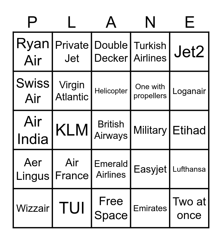 This bingo card has 25 words: Aer Lingus, TUI, British Airways, Emirates, Jet2, Ryan Air, Private Jet, Double Decker, Military, Lufthansa, Swiss Air, Virgin Atlantic, Free Space, Easyjet, Loganair, Wizzair, KLM, Helicopter, One with propellers, Etihad, Air India, Air France, Emerald Airlines, Turkish Airlines and Two at once.