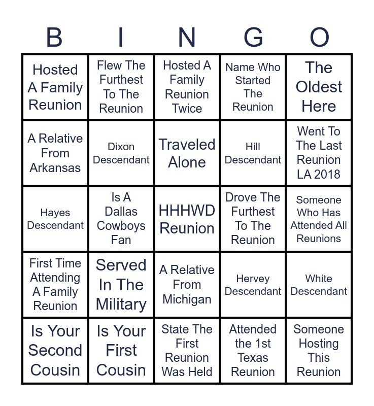 This bingo card has a free space and 24 words: Served In The Military, Is Your First Cousin, Traveled Alone, Is Your Second Cousin, The Oldest Here, Hosted A Family Reunion, A Relative From Arkansas, Flew The Furthest To The Reunion, Drove The Furthest To The Reunion, A Relative From Michigan, Hill Descendant, Hayes Descendant, Hervey Descendant, White Descendant, Dixon Descendant, Attended the 1st Texas Reunion, Someone Who Has Attended All Reunions, Hosted A Family Reunion Twice, Went To The Last Reunion LA 2018, Is A Dallas Cowboys Fan, Someone Hosting This Reunion, First Time Attending A Family Reunion, Name Who Started The Reunion and State The First Reunion Was Held.