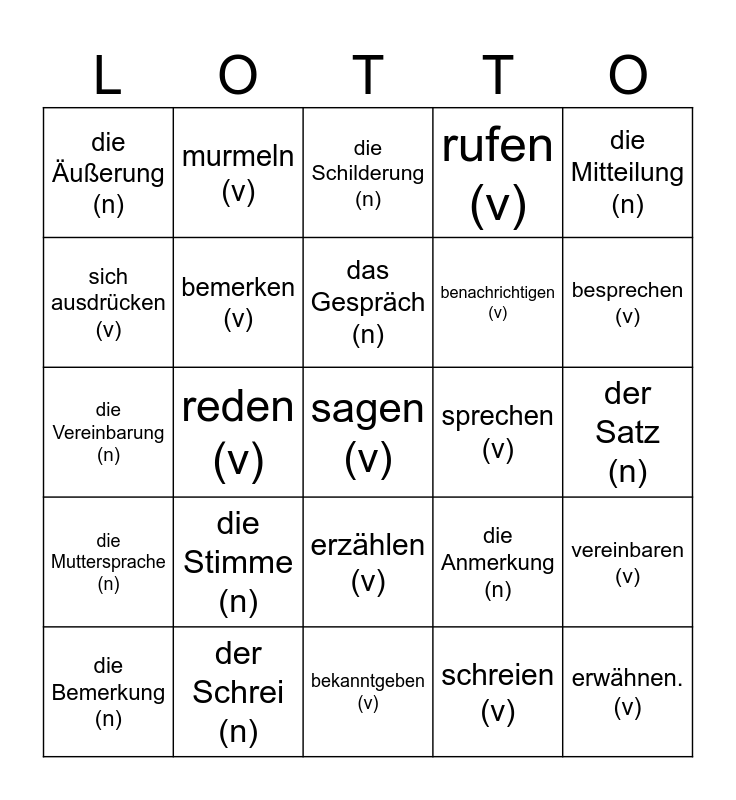 This bingo card has 39 words: Free!, der Ausdruck (n), die Aussage (n), bemerken (v), die Bemerkung (n), erzählen (v), das Gespräch (n), mitteilen (v), die Mitteilung (n), die Muttersprache (n), reden (v), rufen (v), sagen (v), der Satz (n), sprechen (v), die Stimme (n), wiederholen (v), die Äußerung (n), ankündigen (v), die Anmerkung (n), sich ausdrücken (v), bekanntgeben (v), benachrichtigen (v), besprechen (v), die Besprechung (n), betonen (v), erwähnen. (v), flüstern (v), hinzufügen. (v), murmeln (v), mündlich (adj), schildern (v), die Schilderung (n), der Schrei (n), schreien (v), die Unterredung (n), vereinbaren (v), die Vereinbarung (n) and die Wiederholung (n).