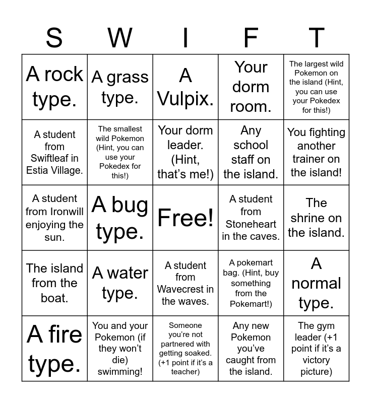 This bingo card has a free space and 24 words: A water type., You and your Pokemon (if they won’t die) swimming!, Your dorm leader. (Hint, that’s me!), A fire type., The largest wild Pokemon on the island (Hint, you can use your Pokedex for this!), A rock type., A student from Swiftleaf in Estia Village., A grass type., A student from Stoneheart in the caves., A student from Wavecrest in the waves., Any school staff on the island., A student from Ironwill enjoying the sun., A pokemart bag. (Hint, buy something from the Pokemart!), A normal type., The smallest wild Pokemon (Hint, you can use your Pokedex for this!), Any new Pokemon you’ve caught from the island., The shrine on the island., A Vulpix., You fighting another trainer on the island!, A bug type., The gym leader (+1 point if it’s a victory picture), The island from the boat., Your dorm room. and Someone you’re not partnered with getting soaked. (+1 point if it’s a teacher).