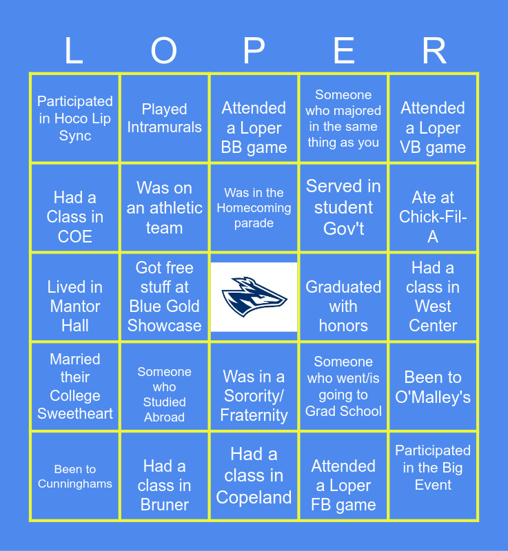 This bingo card has a free space and 24 words: Someone who Studied Abroad, Had a class in Bruner, Was in the Homecoming parade, Been to Cunninghams, Attended a Loper VB game, Participated in Hoco Lip Sync, Had a Class in COE, Played Intramurals, Graduated with honors, Was in a Sorority/ Fraternity, Served in student Gov't, Lived in Mantor Hall, Someone who went/is going to Grad School, Been to O'Malley's, Was on an athletic team, Attended a Loper FB game, Had a class in West Center, Attended a Loper BB game, Ate at Chick-Fil-A, Got free stuff at Blue Gold Showcase, Participated in the Big Event, Married their College Sweetheart, Someone who majored in the same thing as you and Had a class in Copeland.