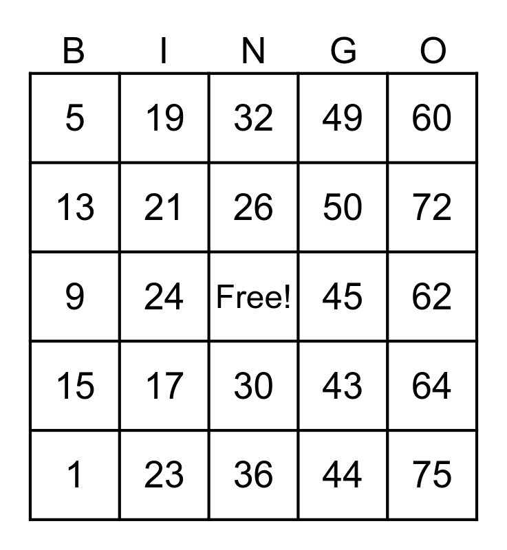 This bingo card has a free space and 24 words: 1, 17, 26, 44, 60, 5, 19, 32, 45, 62, 9, 21, 43, 64, 13, 23, 36, 49, 72, 15, 24, 30, 50 and 75.